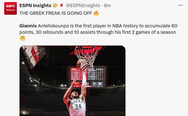 憑借這樣的表現(xiàn),字母哥成為NBA歷史上首位在賽季前兩場比賽中至少轟下60分30籃板10助攻的球員。